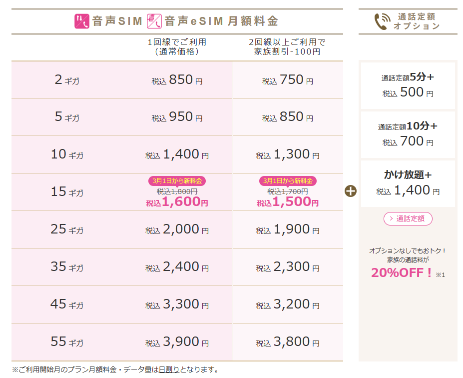 これらのプランは通話やSMSの利用頻度、データ通信の用途に応じて選択することで、1GBプランよりも柔軟に料金を最適化できます。