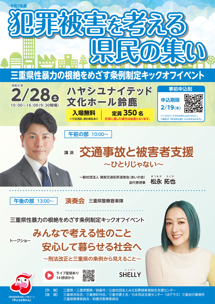 今回は、三重県性暴力の根絶をめざす条例を令和7年10月27日に公布・施行したことから「三重県性暴力の根絶をめざす条例制定キックオフイベント」としても開催します。