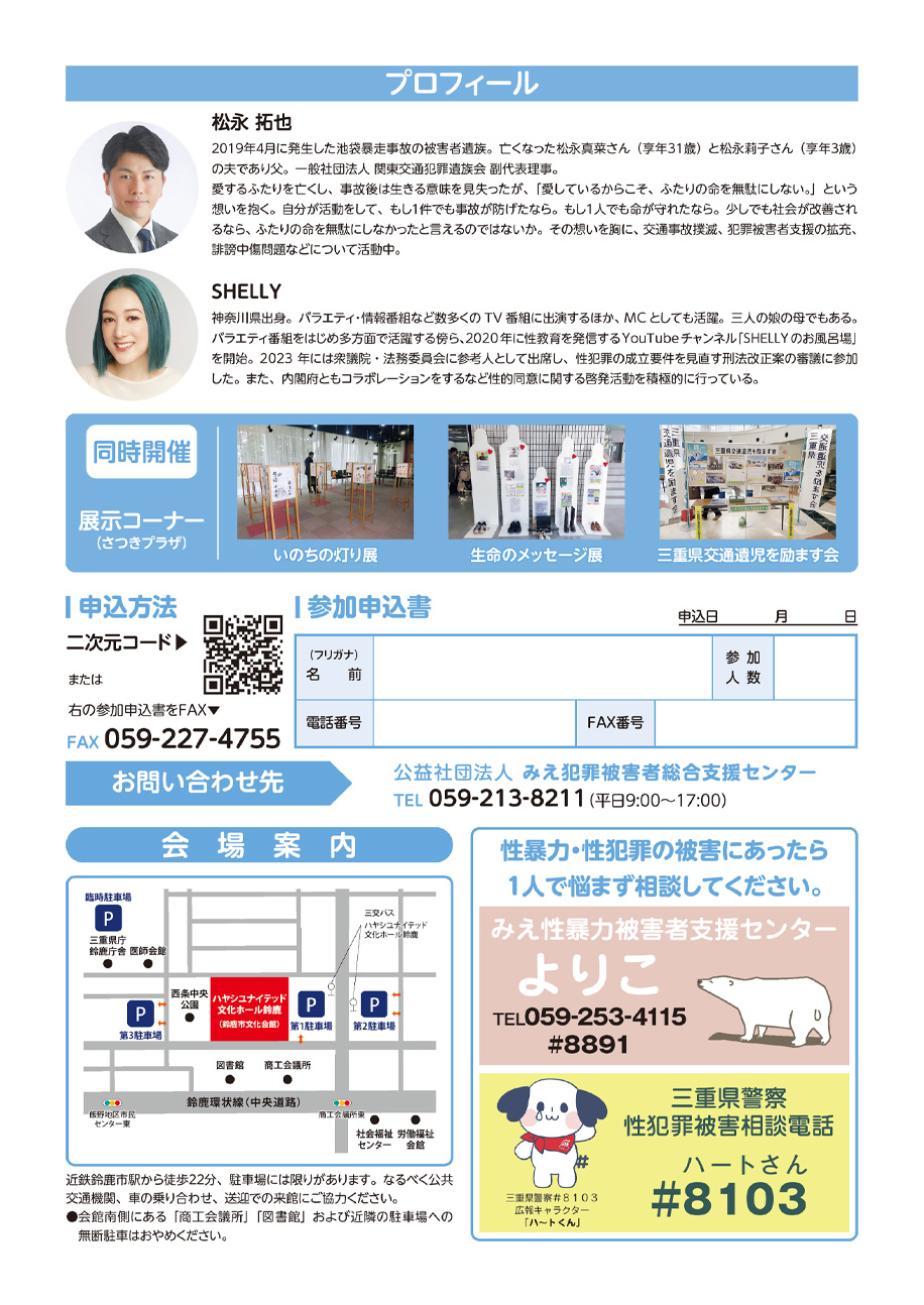 当日は、交通事故被害者遺族の松永拓也さんによる講演や、タレントのSHELLYさんによるトークショーなどを行う予定です。