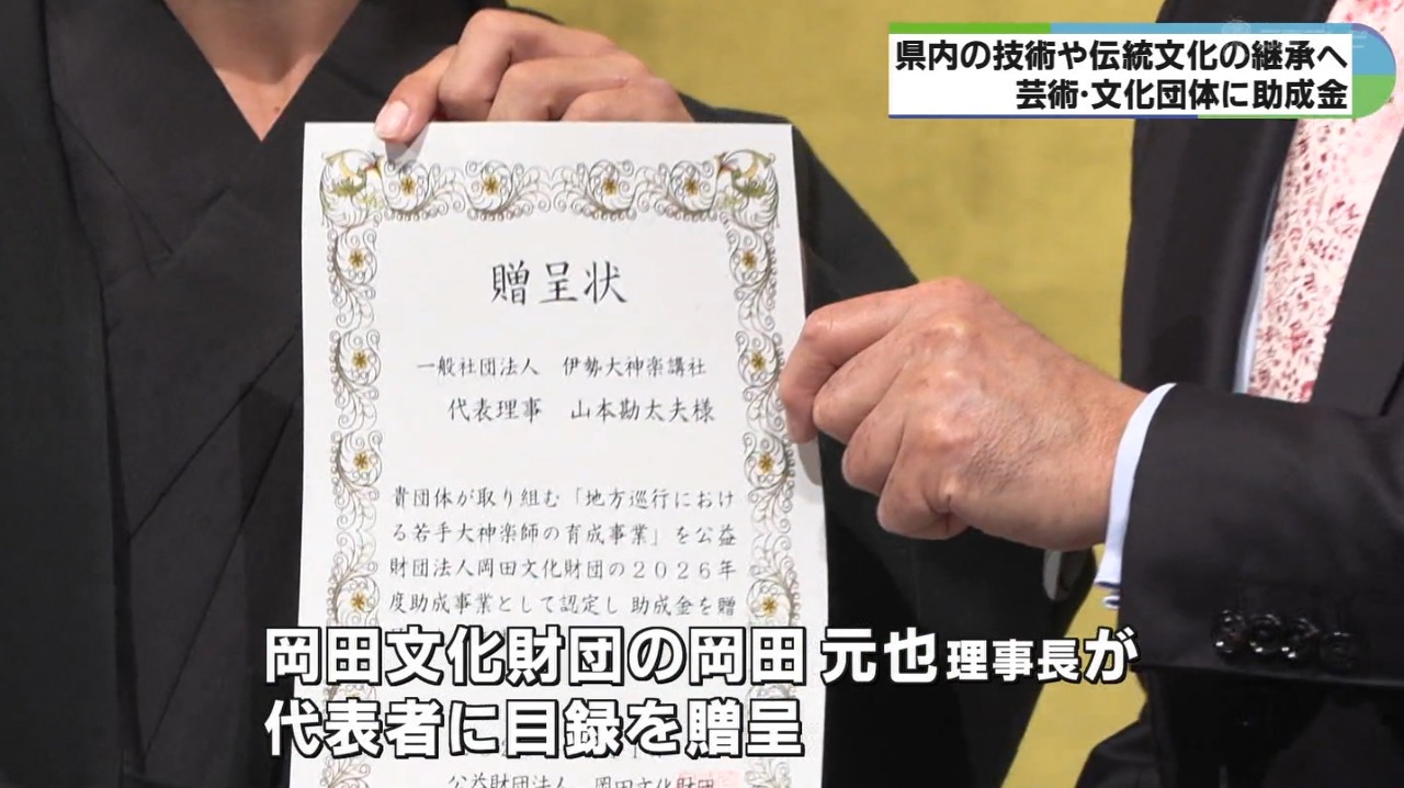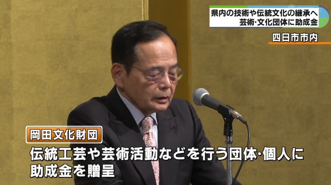 三重県内の技術や伝統文化の継承などに取り組む岡田文化財団が11日、芸術・文化に関する活動を行う団体に助成金を贈りました。