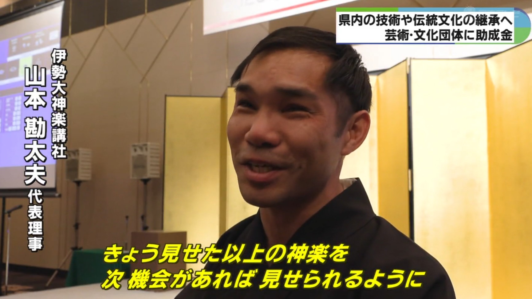 伊勢大神楽講社の山本勘太夫代表理事は「大神楽師をより少しでも魅力のあるものにする事により入門者が増えるので、入門者を養成するための資金や活動費に充てるということで助成をお願いした。今回見せた以上の神楽を見せられるように、その補助にさせていただきたい」と話しました。