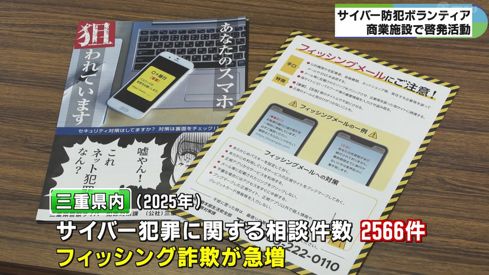 三重県警察本部によりますと、去年1年間のサイバー犯罪に関する相談件数は2566件と高い水準で推移していて、特に偽のサイトに誘導しIDやパスワードなどを入力させて盗み取るフィッシング詐欺が急増しているということです。