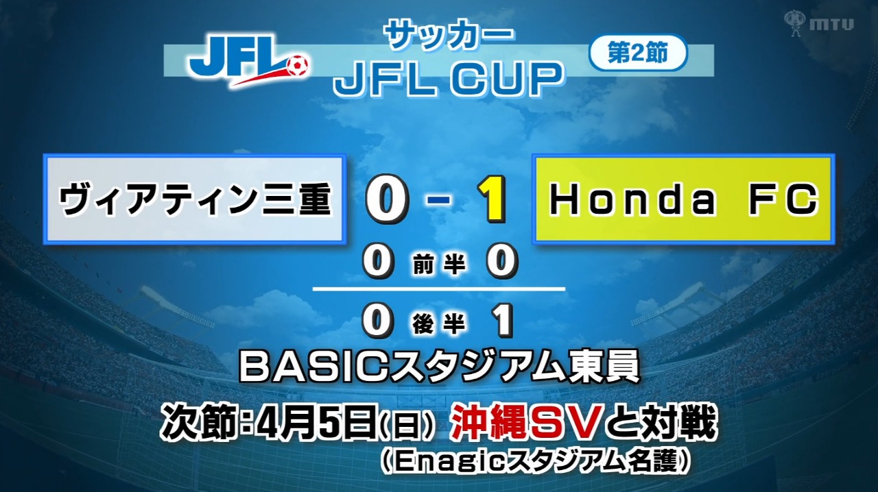 サッカーのアマチュア最高峰リーグ「JFL」=日本フットボールリーグの「JFLCUP」第2節、ヴィアティン三重がHondaFCと対戦し、0対1で負けました。