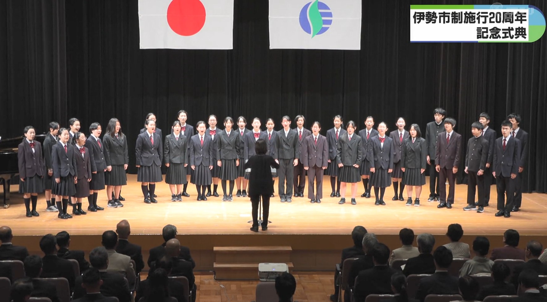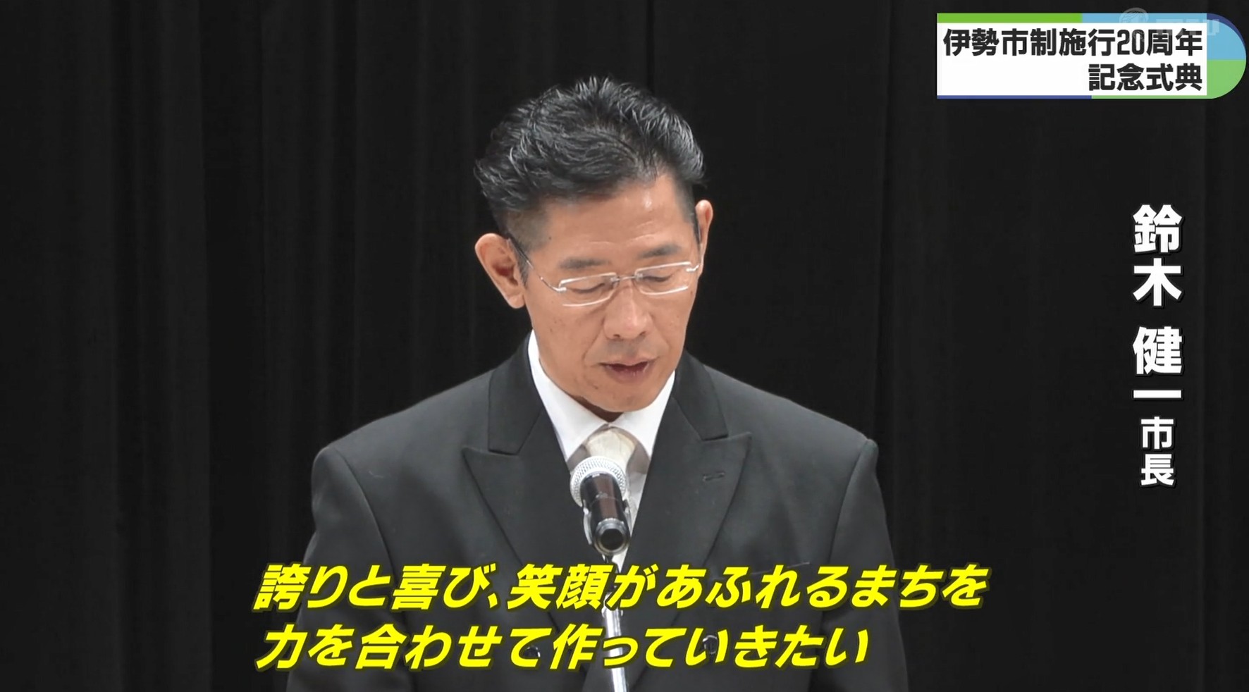 記念式典では、伊勢市の鈴木健一市長が20年の歩みを振り返った上で「自然豊かで歴史、文化、伝統に育まれた伊勢のまちをともに愛し、誇りと喜び、笑顔があふれるまちを力を合わせて作っていきたい」とあいさつしました。