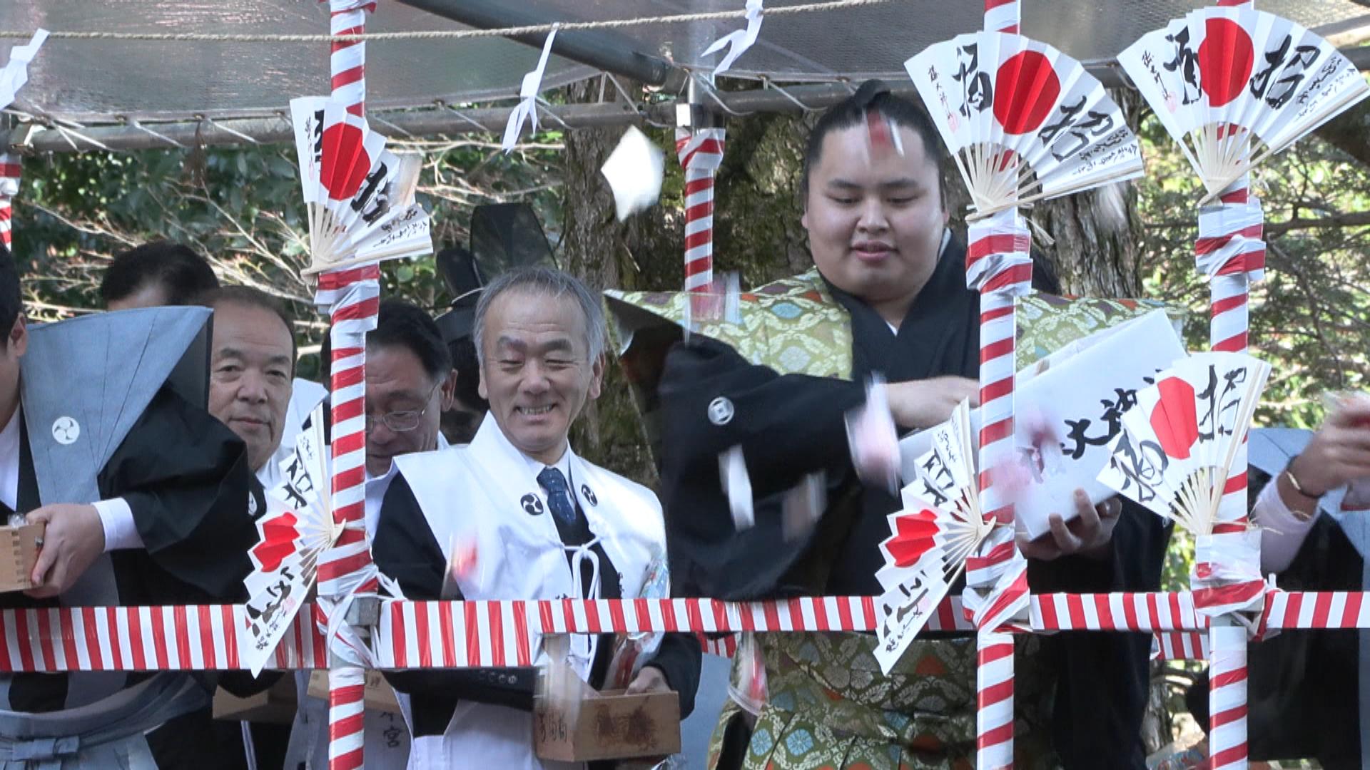 豆まき神事には全国から集まった年男、年女に加え、佐渡ヶ嶽部屋の佐渡ヶ嶽親方と琴勝峰関が参加し、参拝者に向けて豪快に豆やお菓子をまきました。