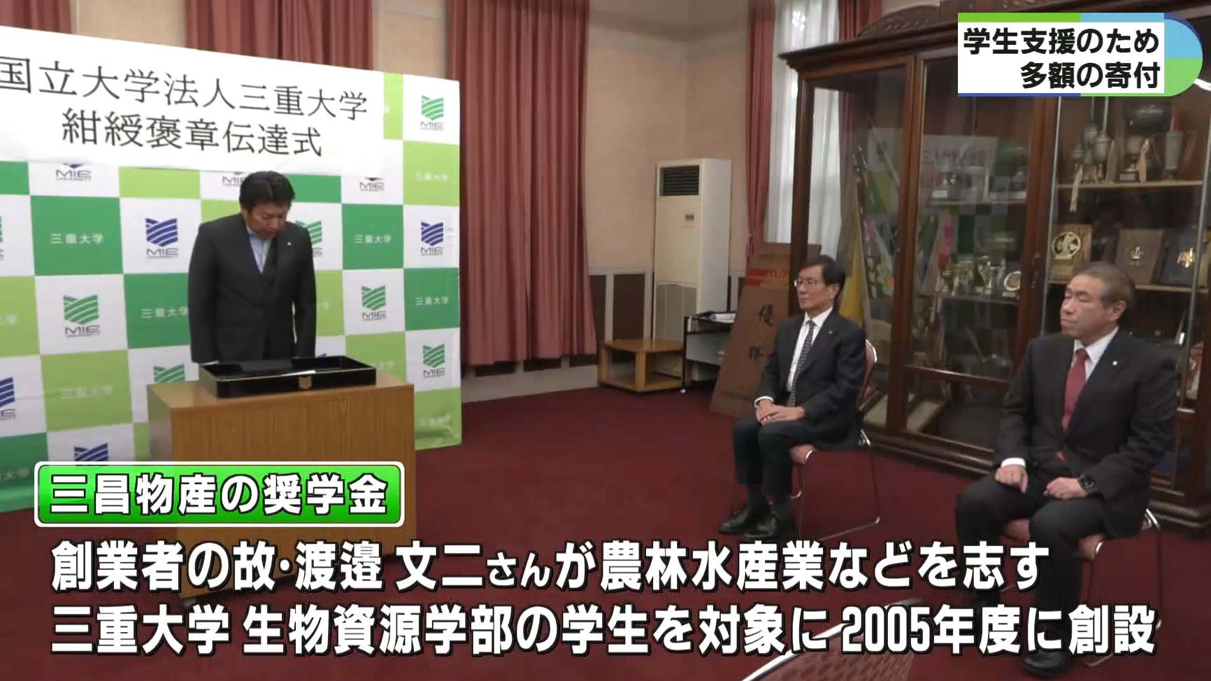 三昌物産が三重大学の学生を対象にした奨学金制度への充当のため寄付を行ったことから、授与されることになりました。