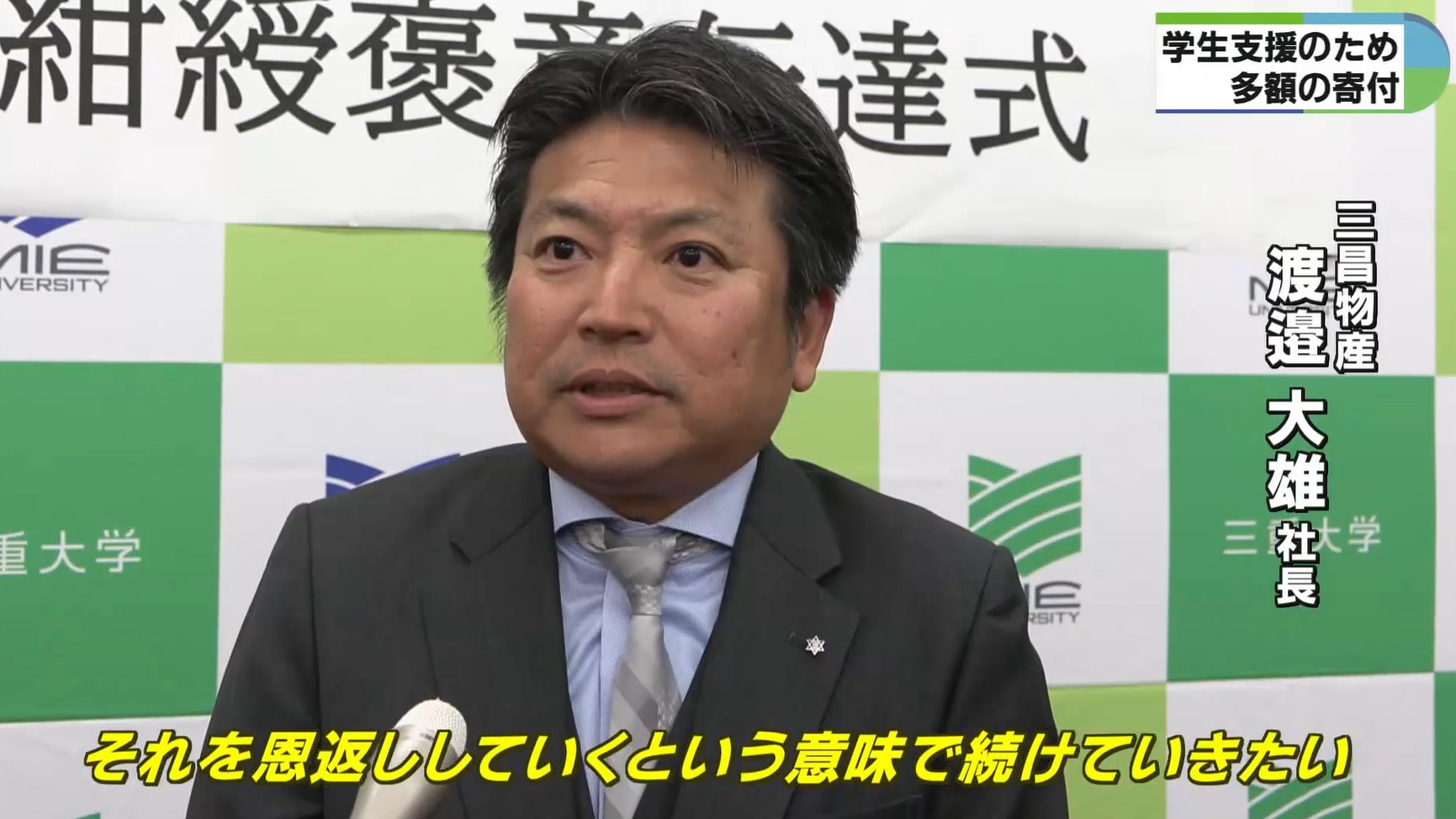 三昌物産の奨学金は、創業者の故・渡邉文二さんが農林水産業などを志す三重大学・生物資源学部の学生を対象に2005年度に創設したもので、歴代の社長も遺志を受け継ぎ、奨学金を継続していて渡邉社長は創業者の孫にあたります。
