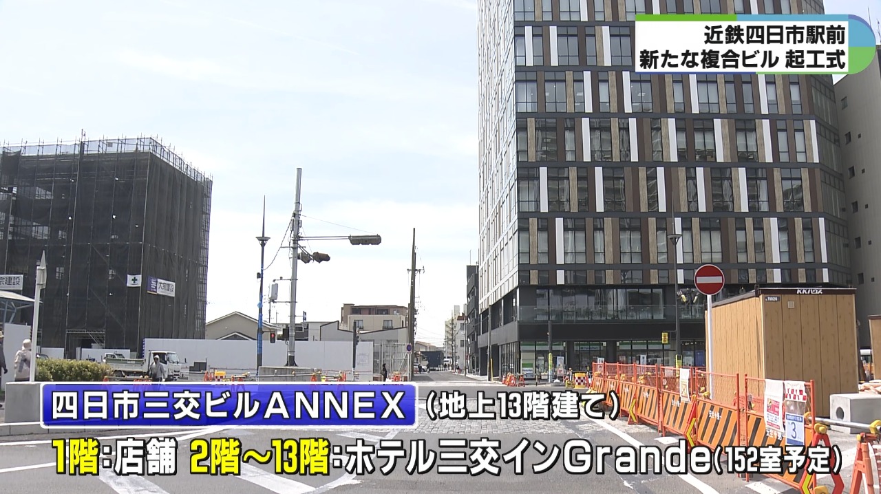 近鉄四日市駅東側に去年8月に開業した四日市三交ビルに隣接する形で建設される複合ビルは、地上13階建てで、1階に店舗が入り、2階から13階までは152室を備えるホテルが入ります。