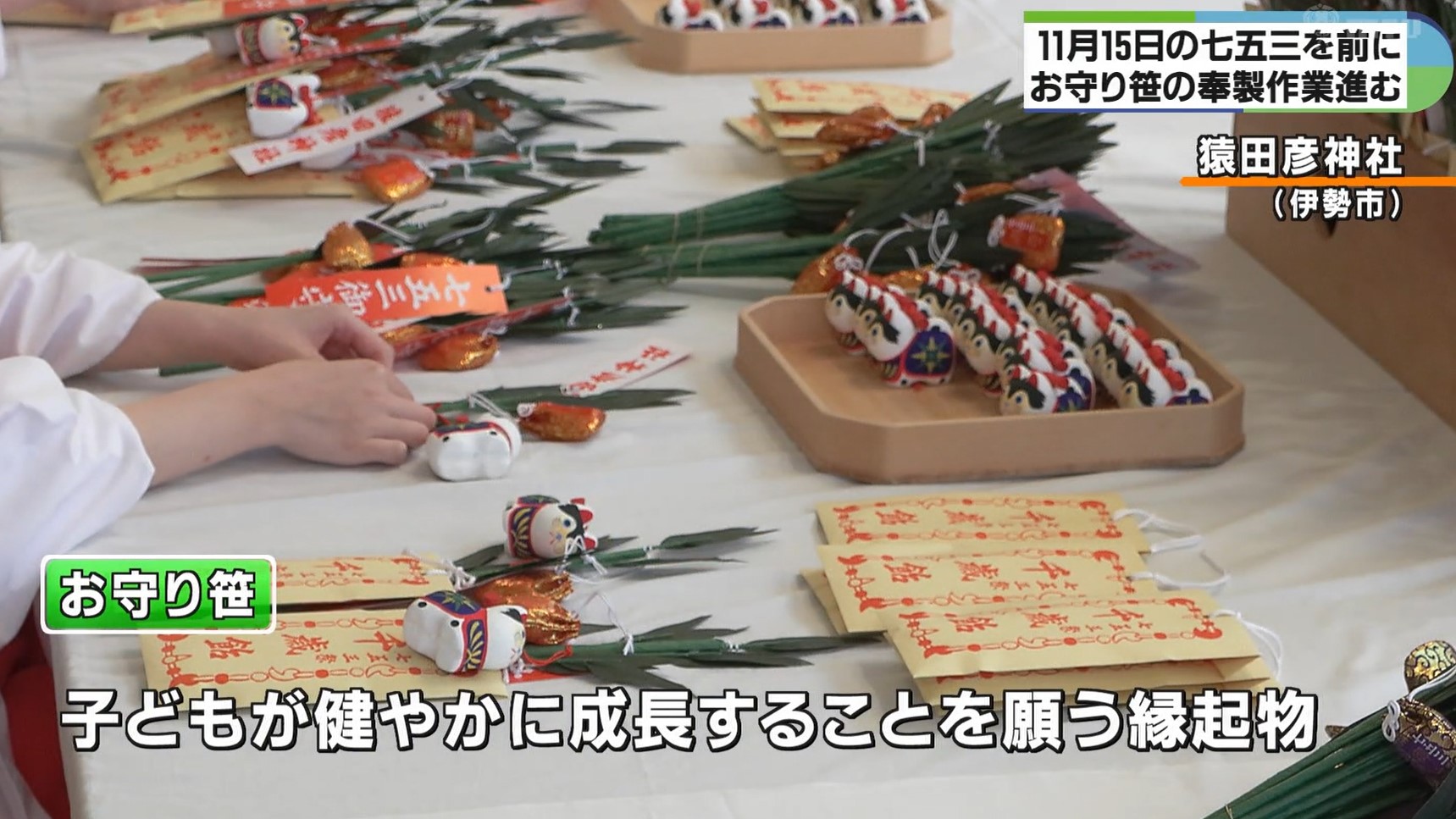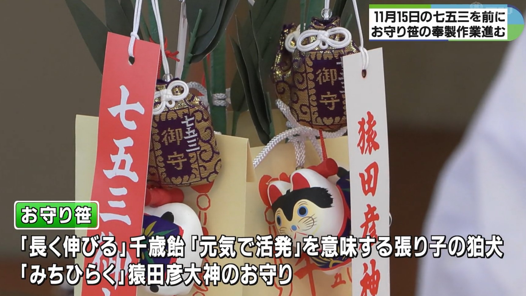 11月15日の「七五三」に向け、三重県伊勢市にある猿田彦神社では祈祷した子どもたちに授与する千歳飴の付いた「お守り笹」の準備が進んでいます。