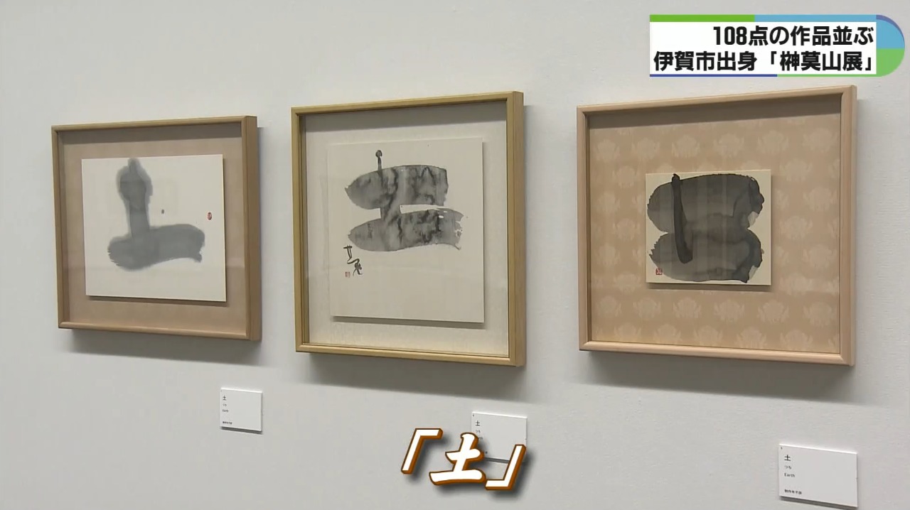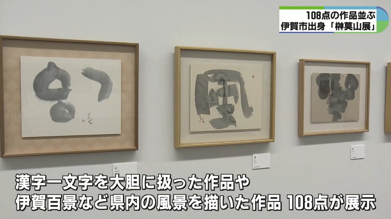 今回は、三重県誕生150周年と、榊莫山の生誕100周年を記念して行われたもので、漢字一文字を大胆に扱った作品や伊賀百景など、県内の風景を描いた作品108点が展示されています。