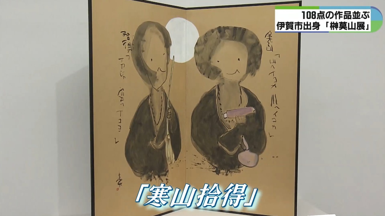中国の唐の時代にいたとされる、人知れず生きた寒山拾得を屏風(びょうぶ)に描いた作品は、のびやかな水墨画と言葉で二人の自由な姿が表現されていて、独創性をつらぬいた莫山の姿とどこか重なっています。