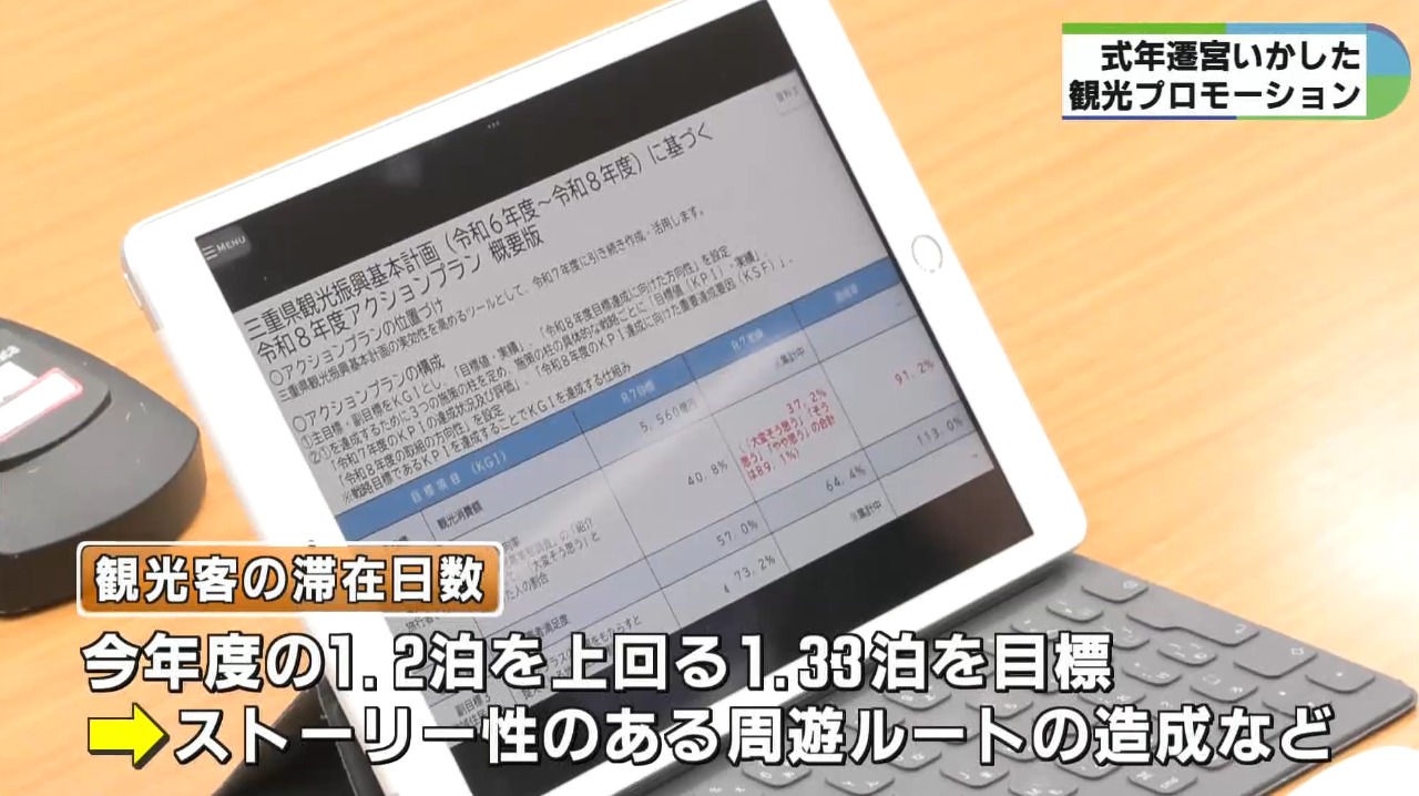 また、三重県の観光の課題と言われている観光客の滞在日数については、今年度の1.2泊を上回る1.33泊を目標に、ストーリー性のある周遊ルートの造成などに取り組むとしています。