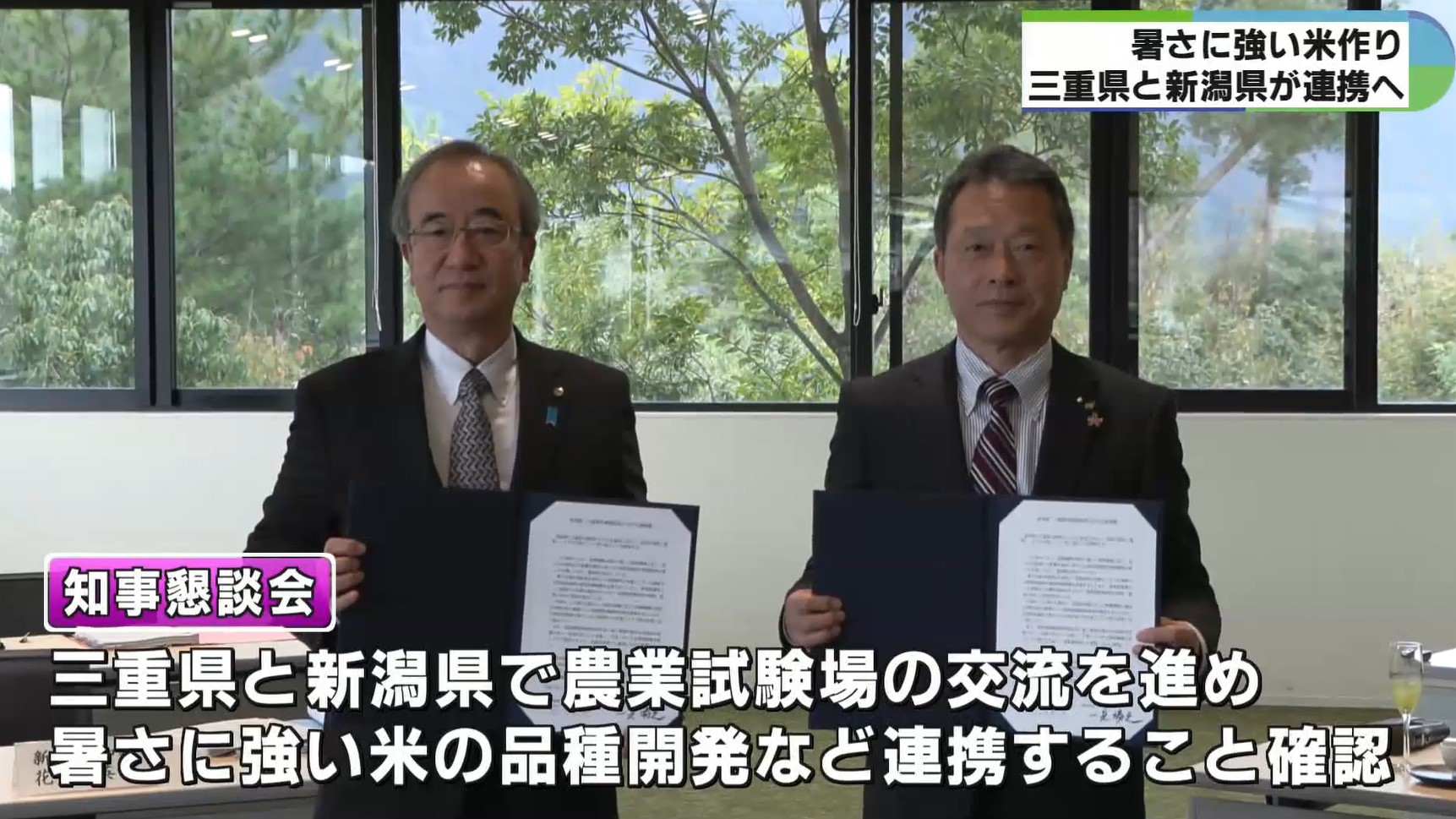 その後、防災や農業に関する取り組みなどについて意見交換が行われ、今後、三重県と新潟県で農業試験場の交流を進め、暑さに強い米の品種開発などに向けて2つの県が連携して取り組みを進めていくことを確認しました。