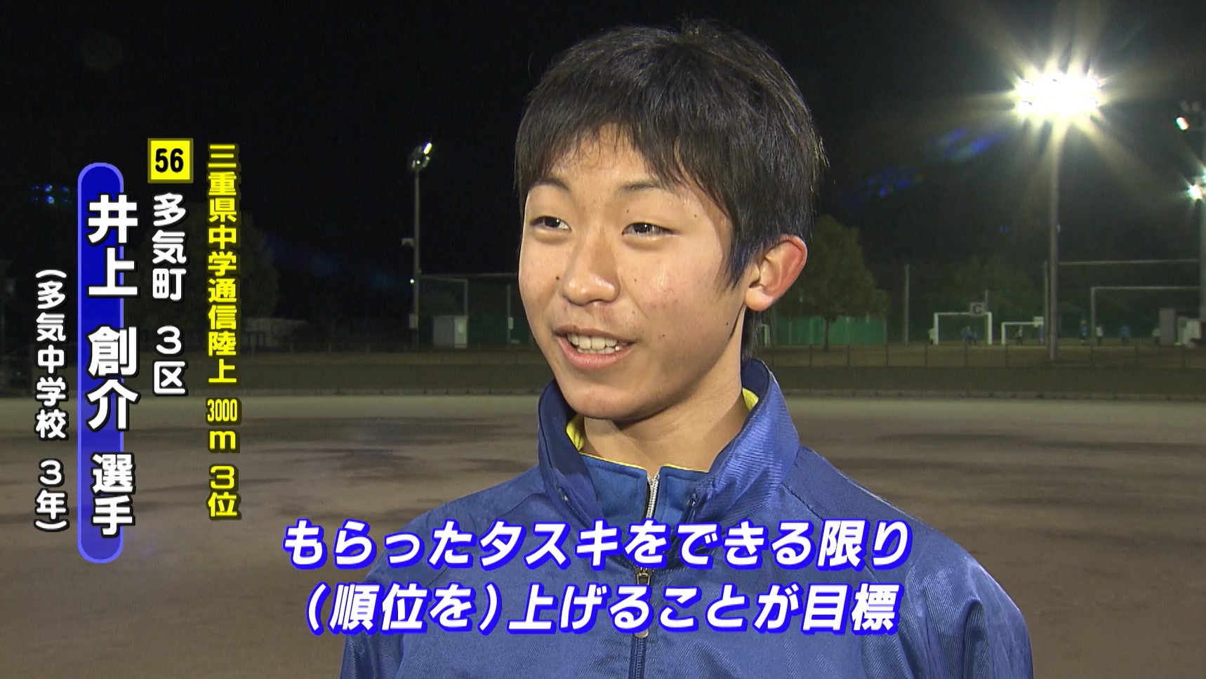 3区を担うのは、3000メートルで三重県3位の井上創介選手。井上選手は「もらったタスキをできる限り(順位を)上げることが目標。1分1秒でも速く、タスキを届けられる走りを全力でしたい」と順位を上げることを目標にかかげます。
