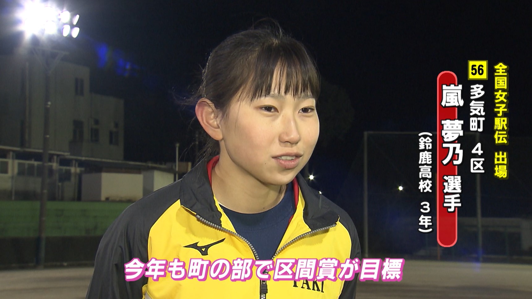 4区には、全国女子駅伝に出場した嵐夢乃選手。嵐選手は「今年も町の部で区間賞が目標。最初から攻めた走りをして最後まで粘って1秒でも速く、多気町チームに貢献できるように頑張る」とチームへの貢献を誓います。