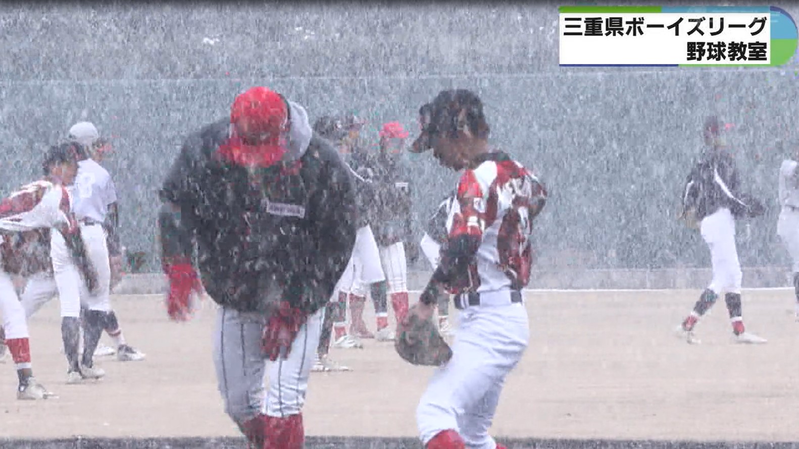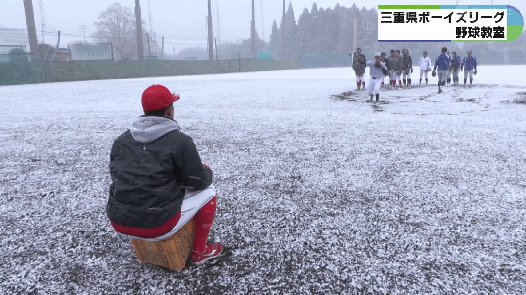25日の鈴鹿市は朝から断続的に雪が降るあいにくのコンディションとなり、一部の練習は省略されましたが、参加した球児たちは社会人選手からのアドバイスを受け、ボールを投げるテンポやバットスイングの力の入れ方などを意識しながら取り組んでいました。