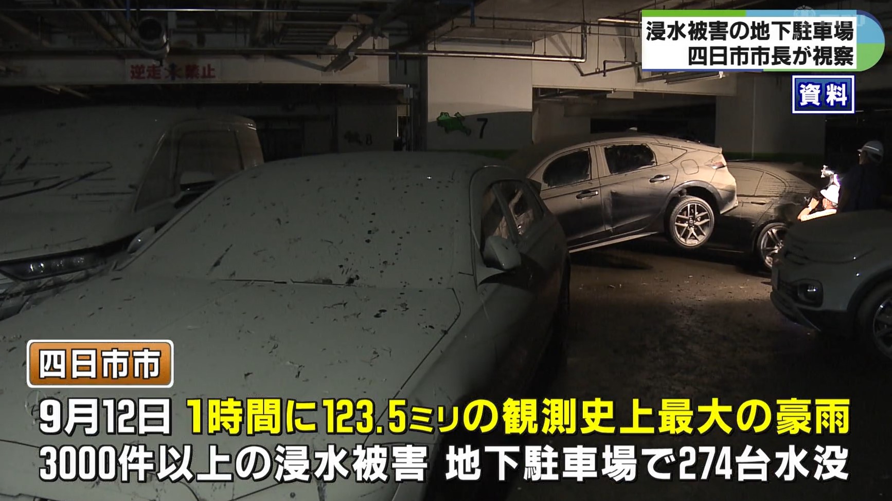 12日、四日市市では観測史上最大となる1時間に123.5ミリの猛烈な雨が降り、市の中心部で3000件以上の浸水被害がでたほか、地下駐車場では大量の雨水が流れ込んだため274台の車が水没し、今も駐車場内に取り残されたままとなっています。