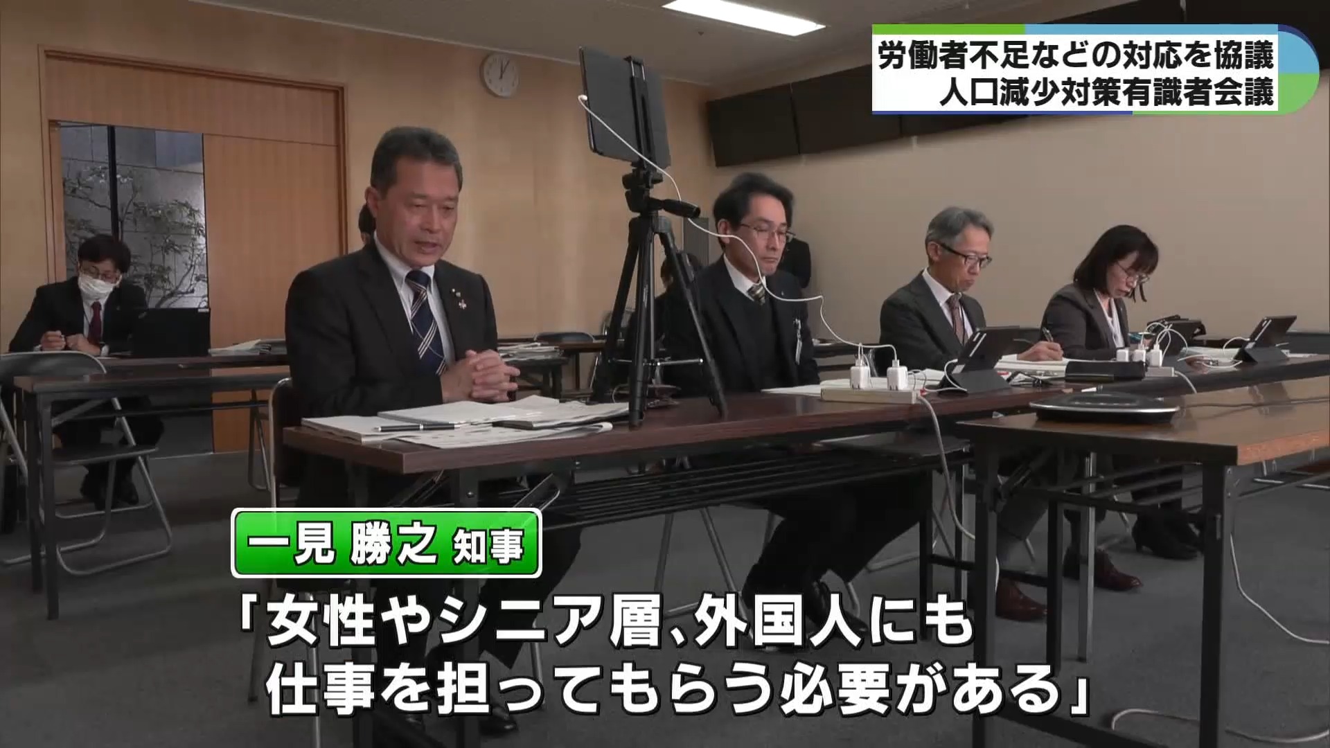 専門家の意見を受けて一見知事は「現実に即した人口推計をしてデータを下地に適応策を考える必要がある。就労構造の変化に伴い、県の産業を維持するためには女性やシニア層、外国人にも仕事を担ってもらわなければならない」と述べました。