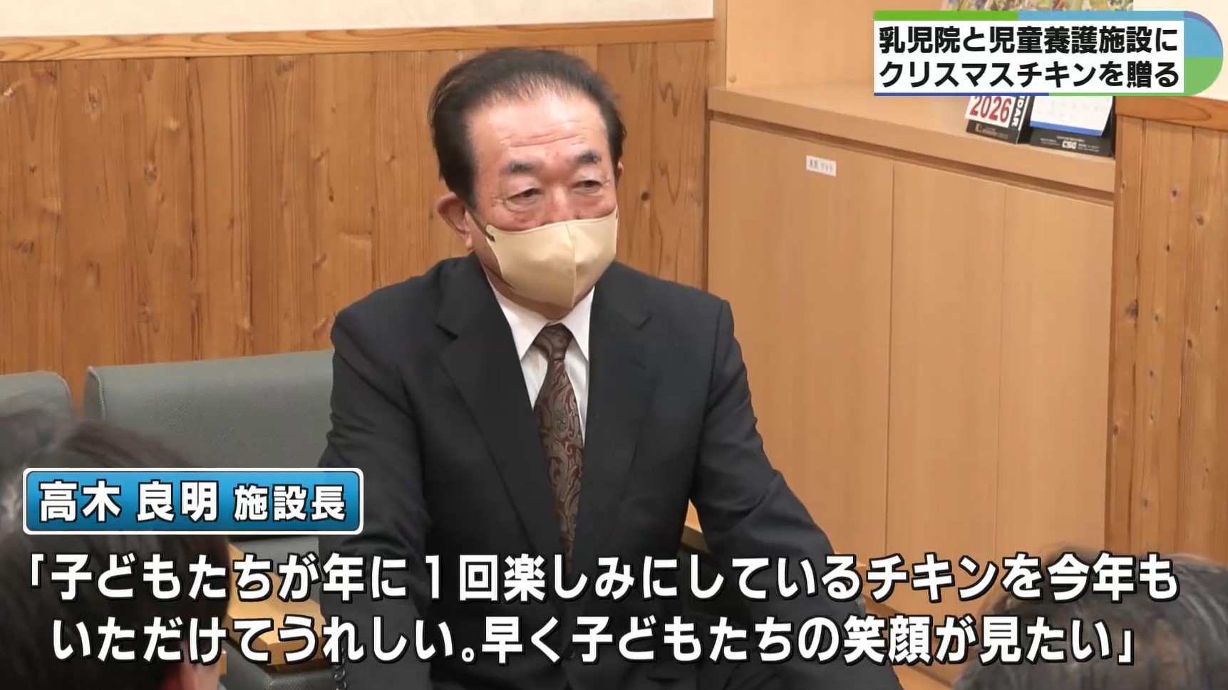高木施設長は「毎年、子どもたちが年に1回楽しみにしているチキンを今年もいただけて嬉しい。早く子どもたちの笑顔が見たい」と感謝を述べました。