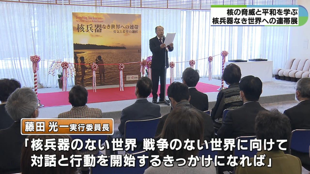 初日の5日はオープニングセレモニーが開かれ、藤田光一実行委員長が「展示会が核兵器のない世界、戦争のない世界にむけて対話と行動を開始するきっかけになれば」と呼びかけました。