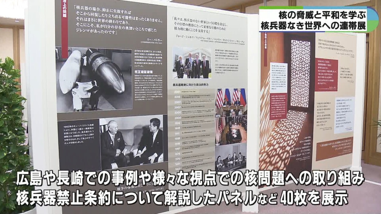会場には広島や長崎での事例や環境や人権など様々な視点での核問題への取り組みのほか、2021年に発効された核兵器禁止条約について解説したパネルなど40枚が展示されています。