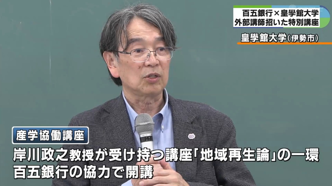 この講座はテレビドラマ化された「高校生レストラン」の仕掛け人で、現在は皇學館大学で教べんをとる岸川政之教授が受け持つ講座の「地域再生論」の一環として百五銀行の協力で開かれました。