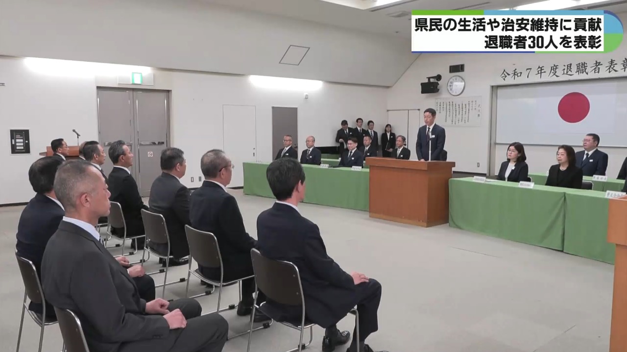 長年にわたり県民の生活や治安維持に貢献した警察官の表彰式が3月31日、三重県警察本部で行われました。