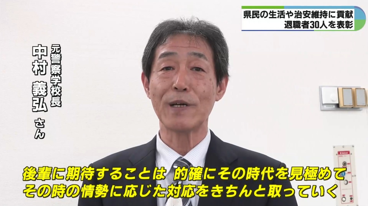 元警察学校長の中村義弘さんは「大きな事件はもちろんだが、特に気にかけていたのはむしろ小さい身近な事件について一生懸命、困っている人のために何ができるのかという思いで取り組んできた37年間だった。的確にその時代を見極めて、その時の情勢に応じた対応をきちんと取っていく。それが己のためではなく、県民へ向いた仕事であることを切に願っている」と話しました。