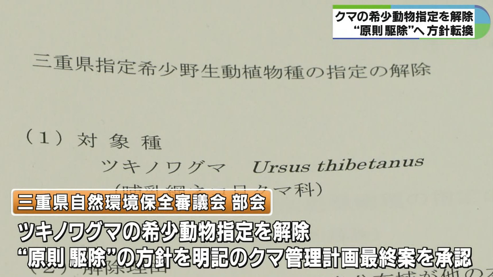クマによる被害が全国で相次いでいることを受け、三重県の条例で希少動物に指定されているツキノワグマについて、指定を解除することが27日開かれた県自然環境保全審議会の部会で承認されました。