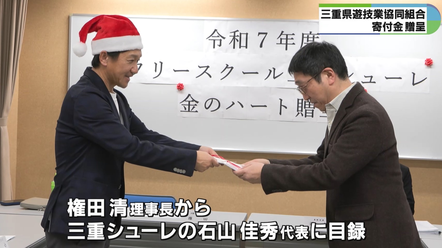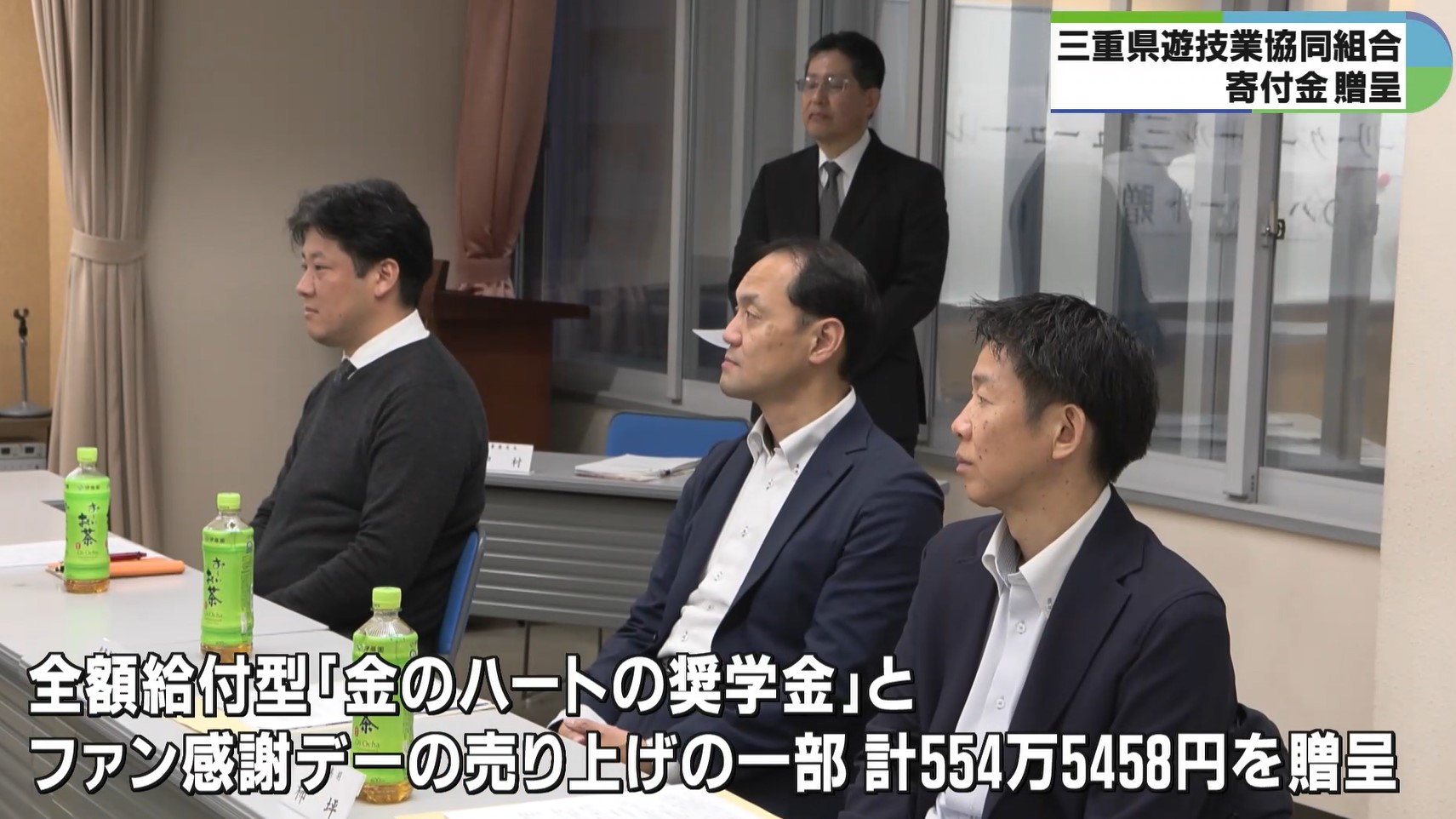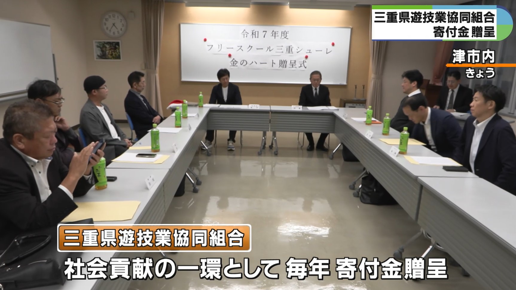 三重県内のパチンコ・パチスロ店などでつくる三重県遊技業協同組合が27日、フリースクール三重シューレに寄付金を贈りました。