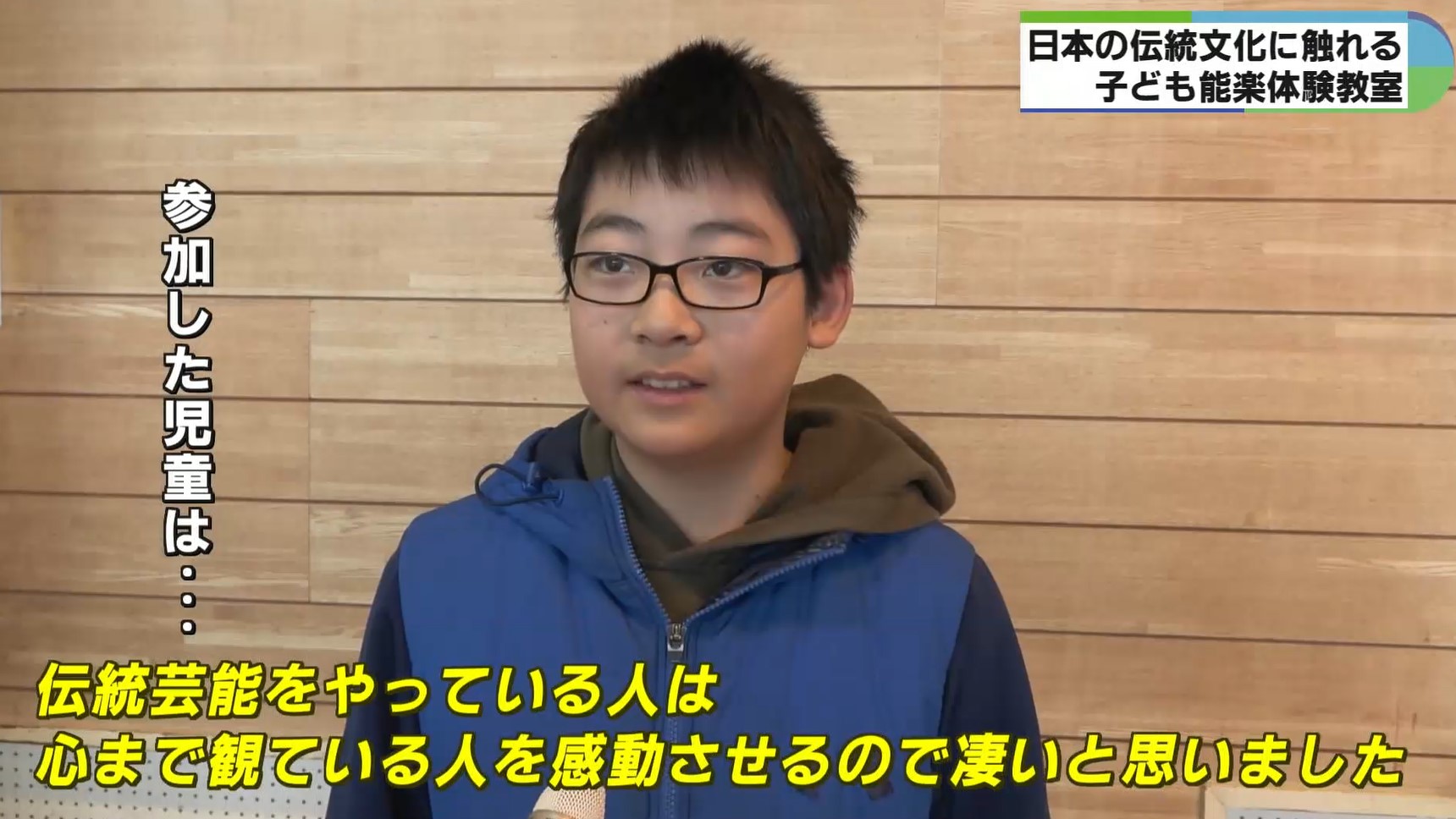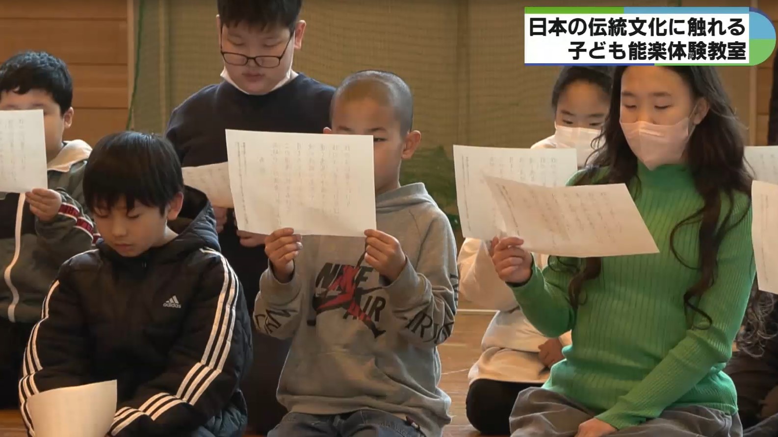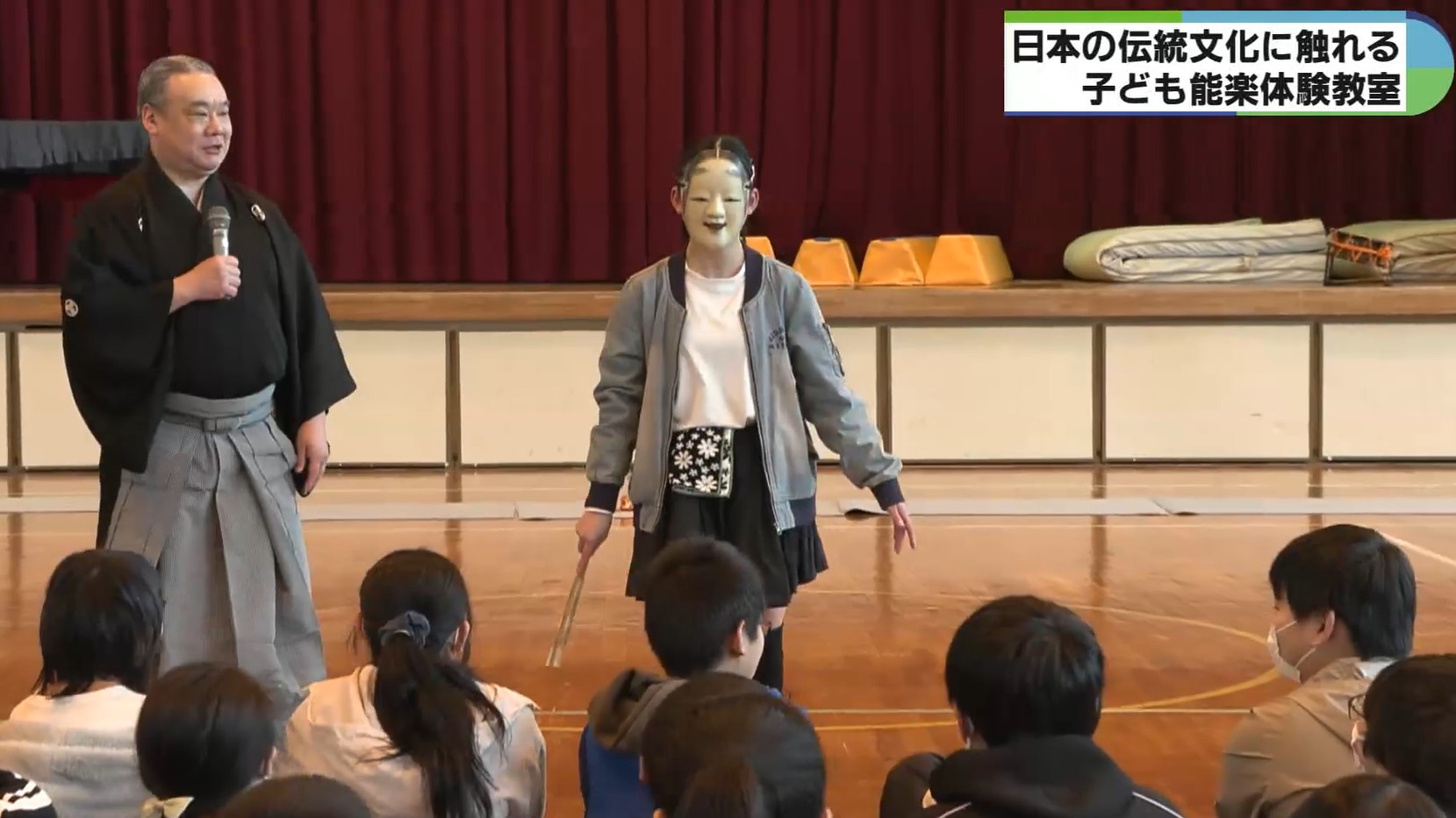 さらに、能面を付けて舞を体験する時間もあり、子どもたちは直接、大倉さんから指導を受けながら日本の伝統文化に触れていました。