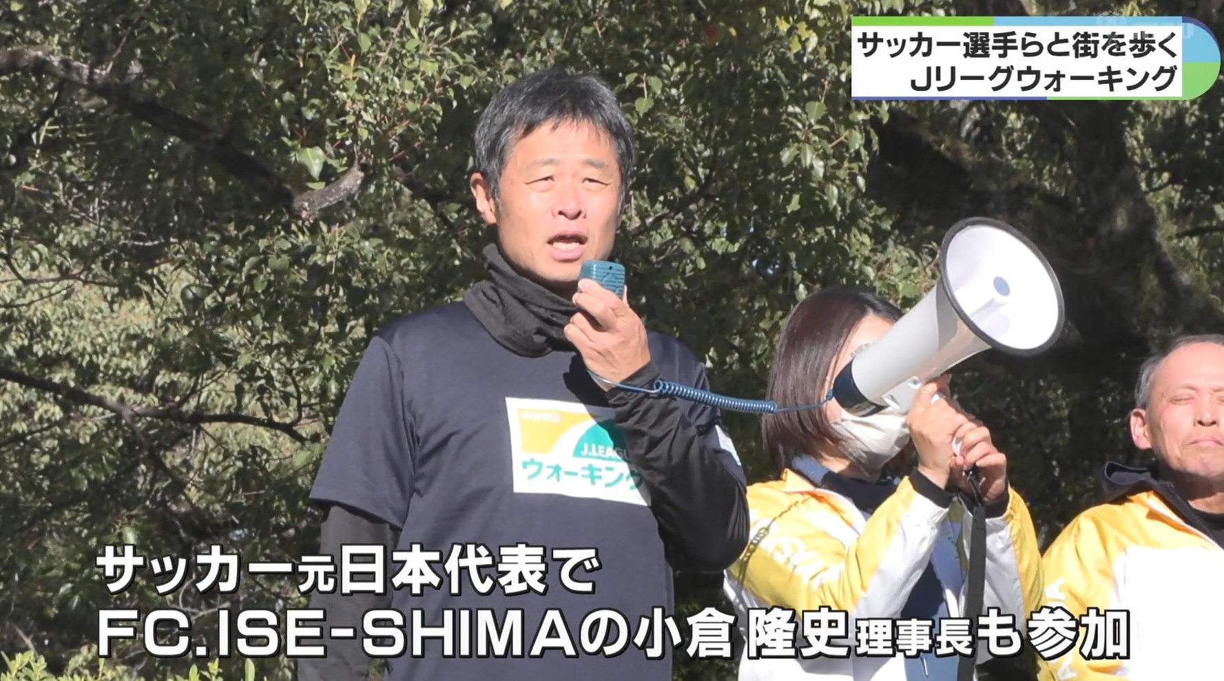 イベントには、ゲストとしてサッカー元日本代表で三重県の中南勢地域を拠点に活動する社会人サッカーチームFC.ISE-SHIMAの小倉隆史理事長も参加し、チームの選手たちとともにウォーキングをスタート。