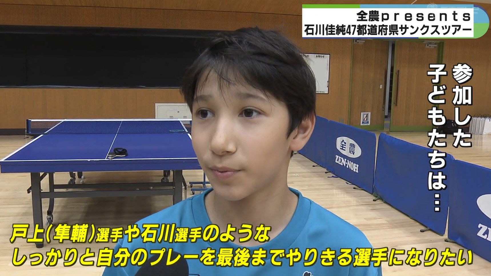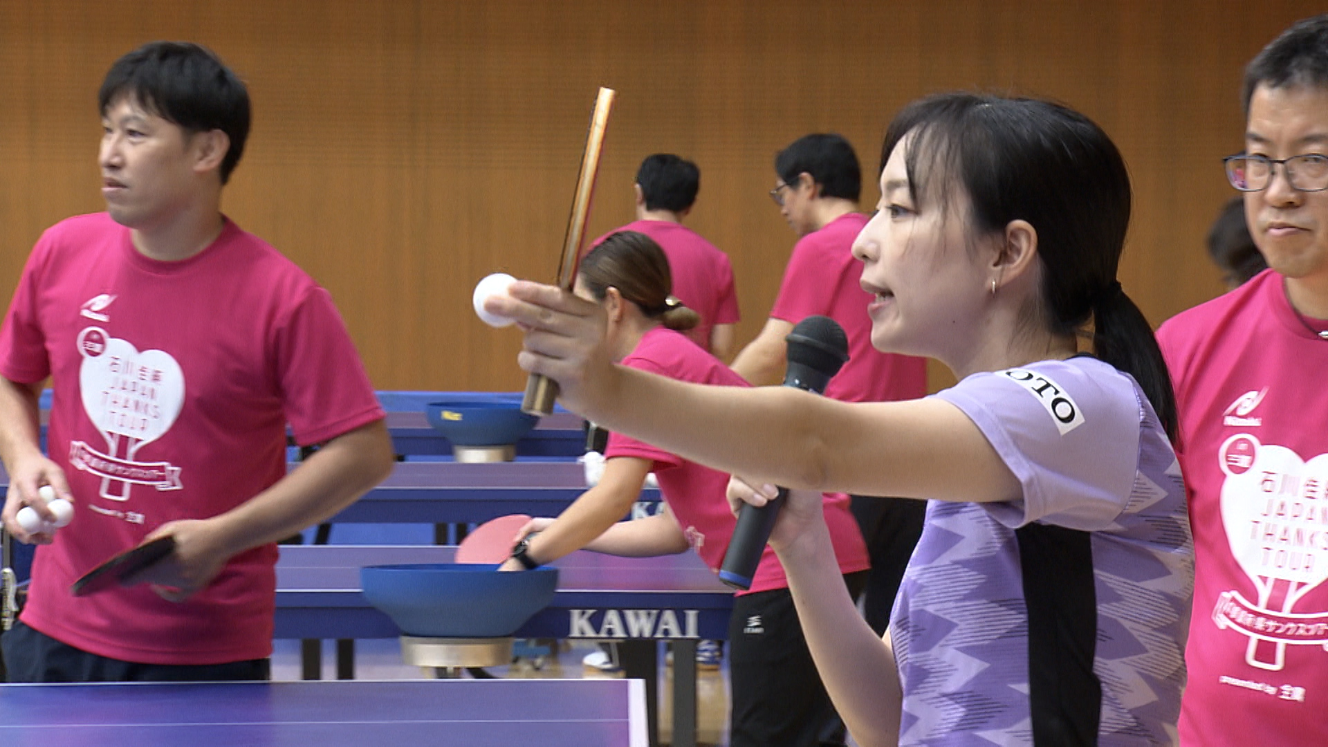 このイベントは、石川さんが全国各地で子どもたちと交流しながら卓球の魅力やスポーツの楽しさを伝えようと開かれているもので、県内で卓球に取り組んでいる小学4年生から6年生50人が参加しました。