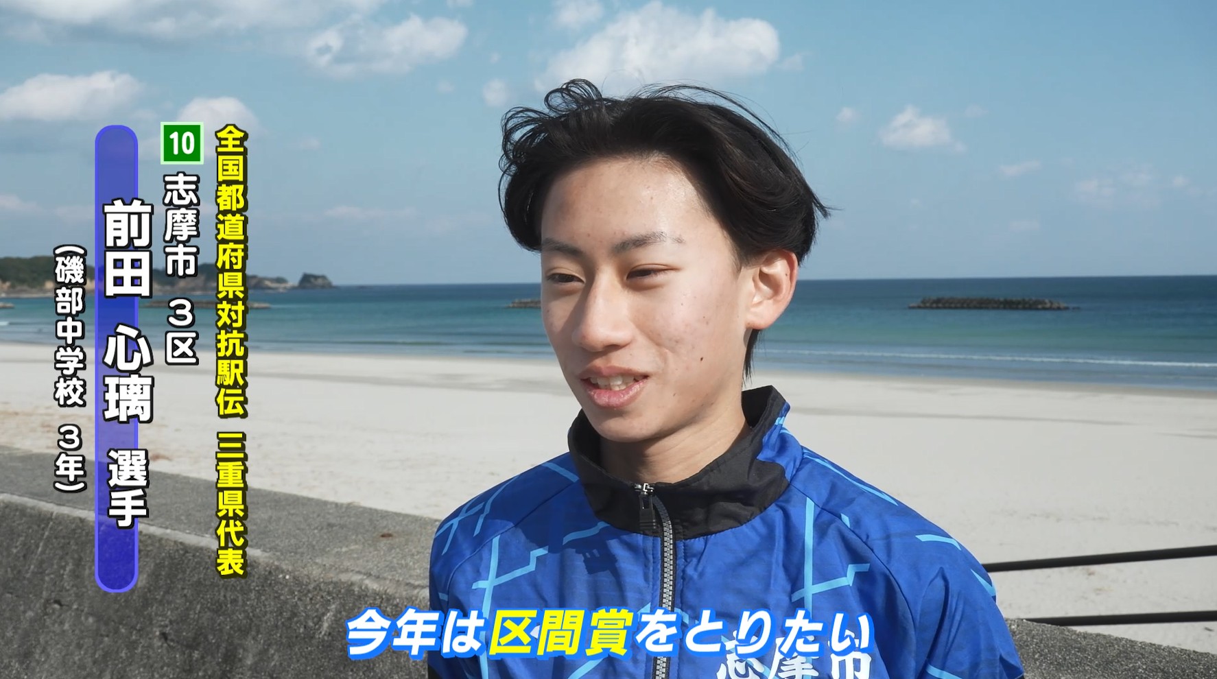 前田選手は「去年は区間2位と悔しい結果に終わってしまったので、今年は区間賞を取りたい。市の部5位は決して目指せない順位じゃないので1、2、3区で流れに乗って、先頭に立てたら。区間賞を取ってチーム志摩を勢いづけられるように頑張ります」と区間賞を誓います。