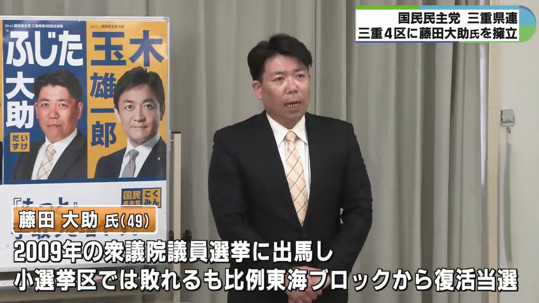 国民民主党・三重県連は20日、2月8日に投開票が予定されている衆議院議員選挙の三重4区に、元衆議院議員で会社社長の藤田大助氏を擁立すると発表しました。