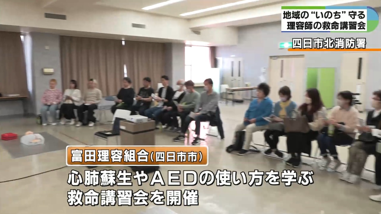 四日市市の富田理容組合は30日、四日市北消防署で心肺蘇生やAEDの使い方を学ぶ応急手当講習会を開催しました。