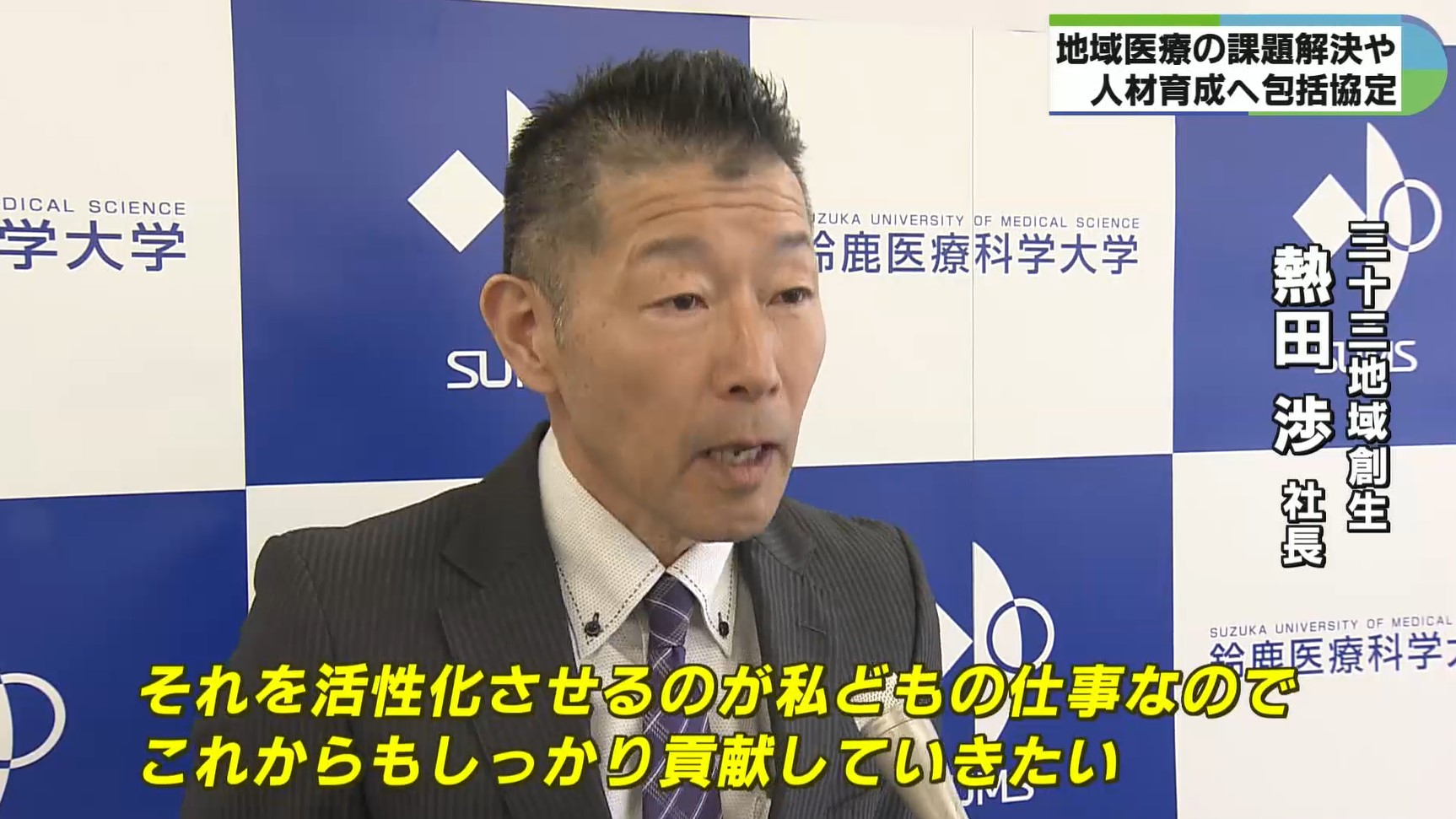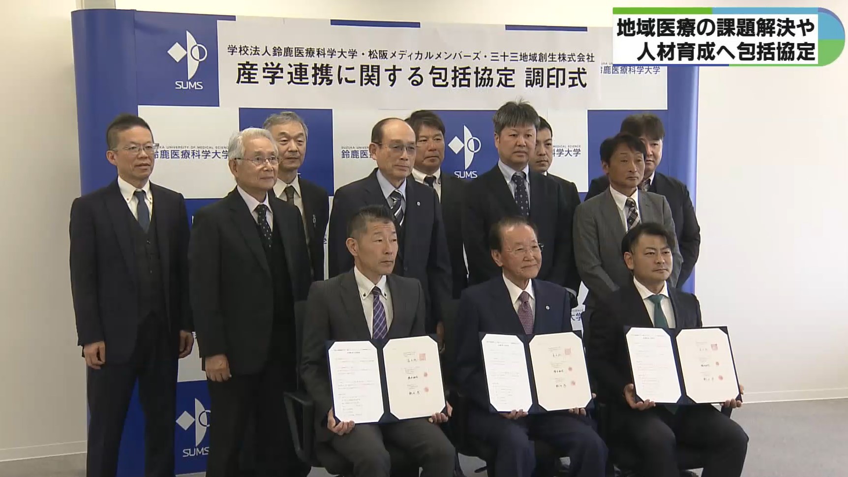 地域医療の課題解決や人材育成、産業振興などを目的に、鈴鹿医療科学大学と三十三地域創生、松阪市内の医療関連企業6社でつくる松阪メディカルメンバーズが包括連携協定を結びました。