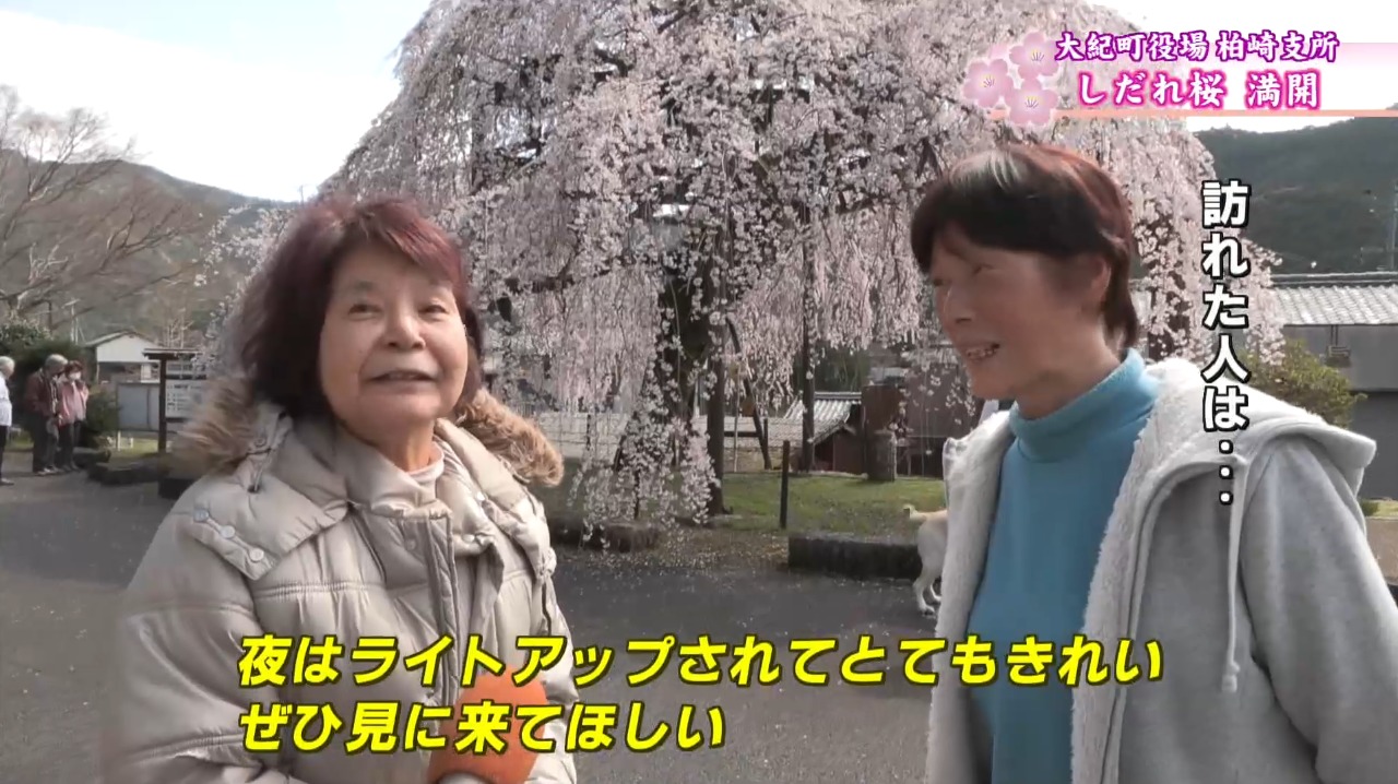 23日の大紀町は曇り時々晴で一時雨も降り、変化に富んだ天気となりましたが、訪れた人たちは様々な表情をみせるしだれ桜を楽しんでいました。