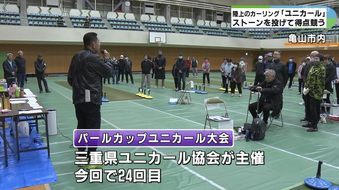 スウェーデンで考案された陸上のカーリングとも呼ばれる室内ニュースポーツ「ユニカール」の大会が15日三重県亀山市で開かれました。