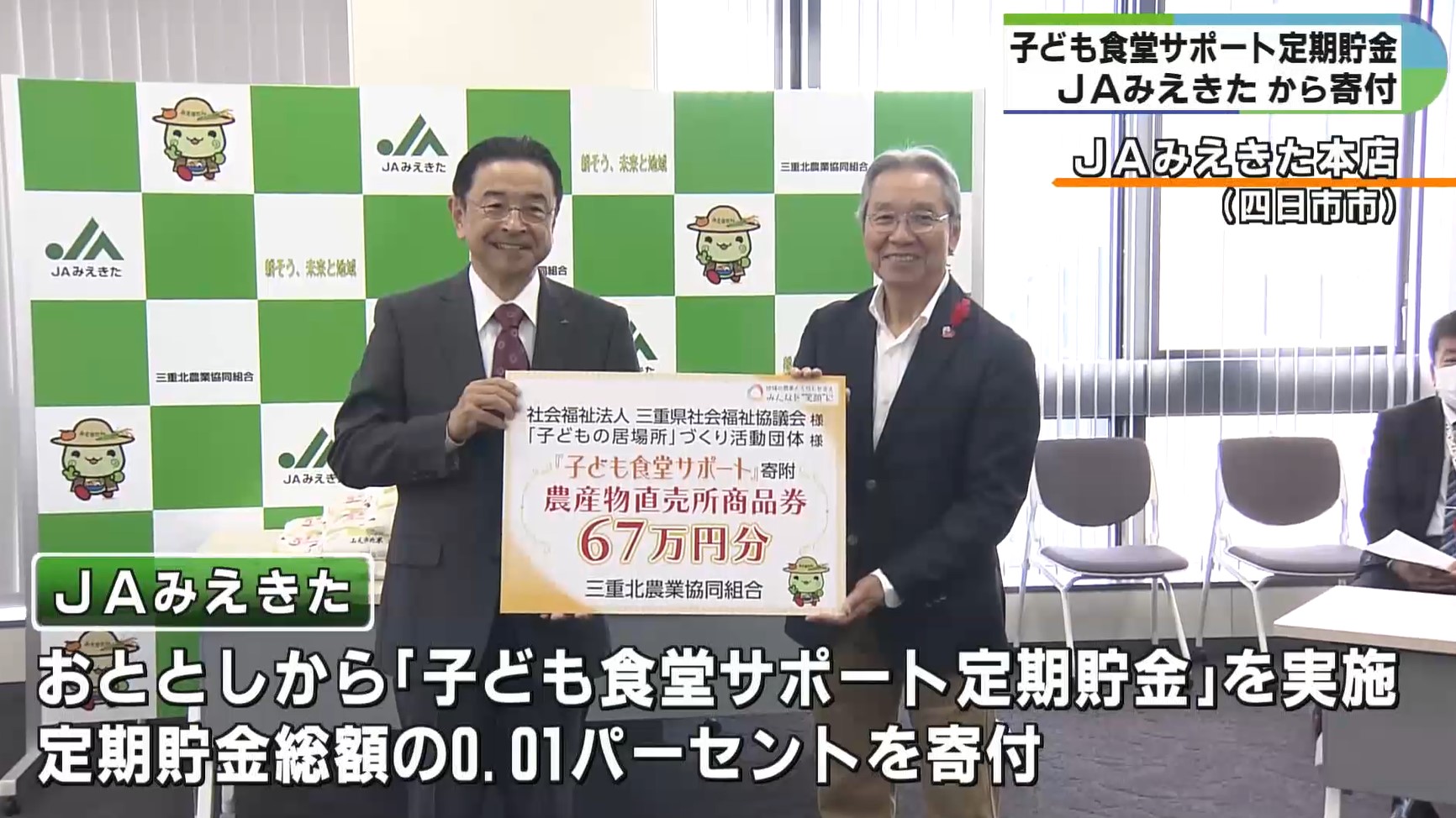 JAみえきたでは、地域貢献の一環として、おととしから「子ども食堂サポート定期貯金」を行っていて、貯金総額の0.01%を寄付しています。
