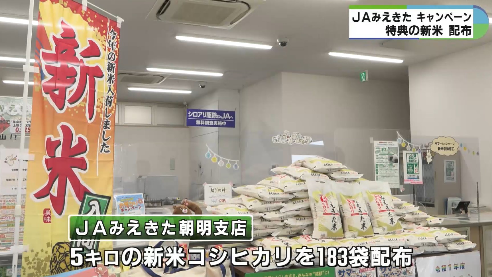 今回のキャンペーンで、四日市市のJAみえきた朝明支店では、1袋5キロの新米コシヒカリ183袋が配布され、利用者が笑顔で受け取っていました。
