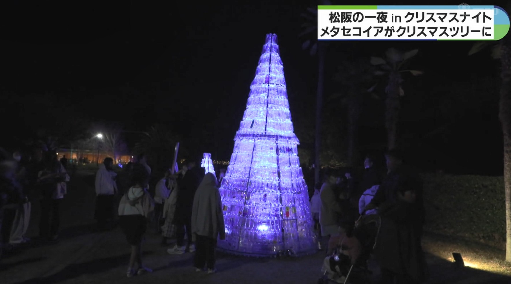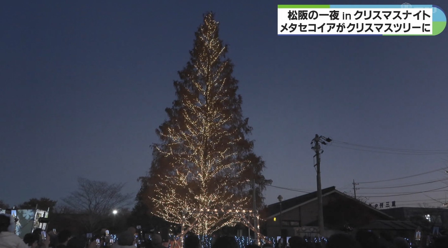 高さ約22メートルのメタセコイアの木をクリスマスツリーに見立ててライトアップするイベントが、三重県松阪市にある鈴の森公園で6日夜から始まり、点灯式が行われました。