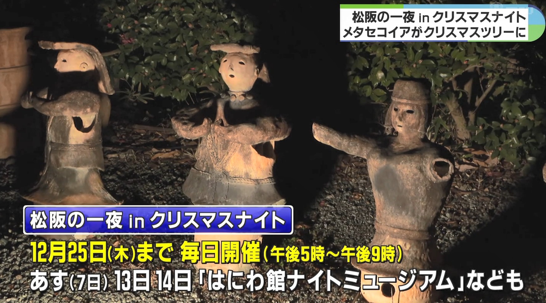 この「松阪の一夜inクリスマスナイト」は12月25日までの期間、午後5時から午後9時まで毎日行われ、7日・13日・14日には「はにわ館ナイトミュージアム」や謎解きイベントなどが予定されています。