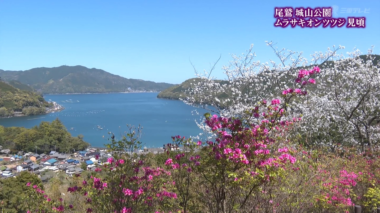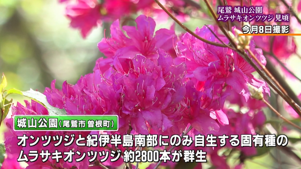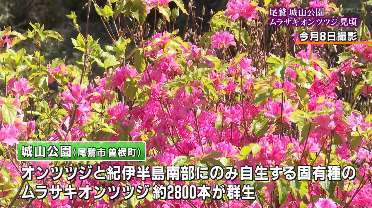 尾鷲市曽根町の城山公園のふもとから山頂にかけては、オンツツジと、紀伊半島南部にのみ自生する固有種のムラサキオンツツジ、約2800本が群生し、見ごろを迎えています。