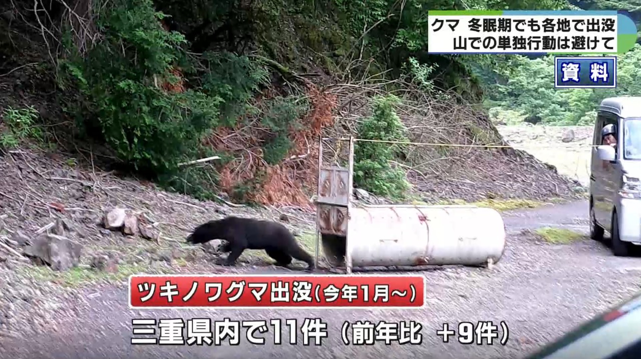 三重県によりますと、一般的にクマの冬眠時期にあたる今年1月以降、県内ではツキノワグマの出没が去年より9件多い11件確認されています。
