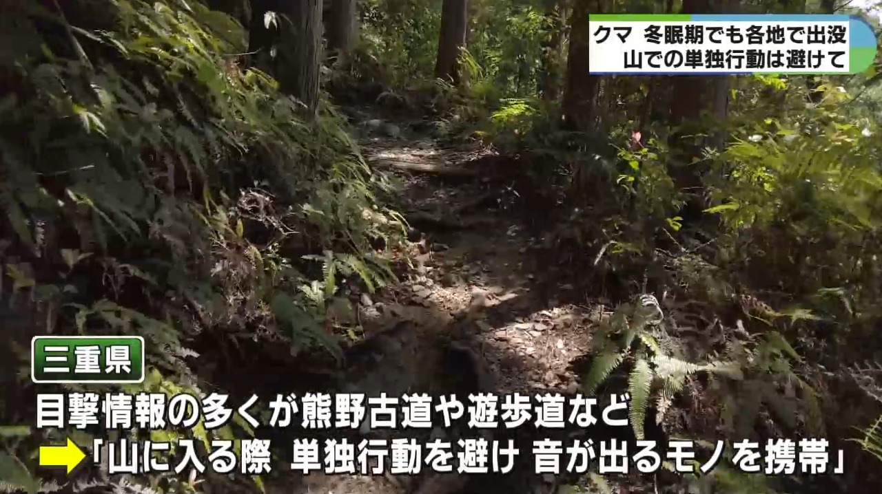 三重県によりますと、目撃情報の多くが熊野古道や遊歩道などで確認されていて、三重県の担当者は「山に入る際は単独行動を避けて、鈴やラジオなどの音が出るモノを携帯してほしい」と呼びかけています。