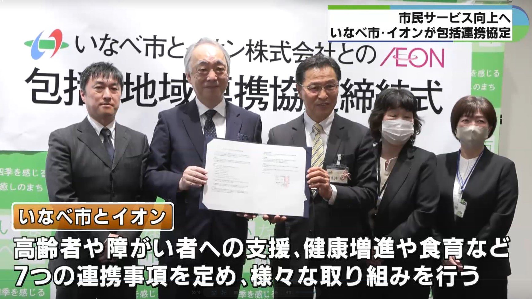 いなべ市とイオンは高齢者や障がい者への支援をはじめ、健康増進や食育など7つの連携事項を定め、さまざまな取り組みを行うことにしています。