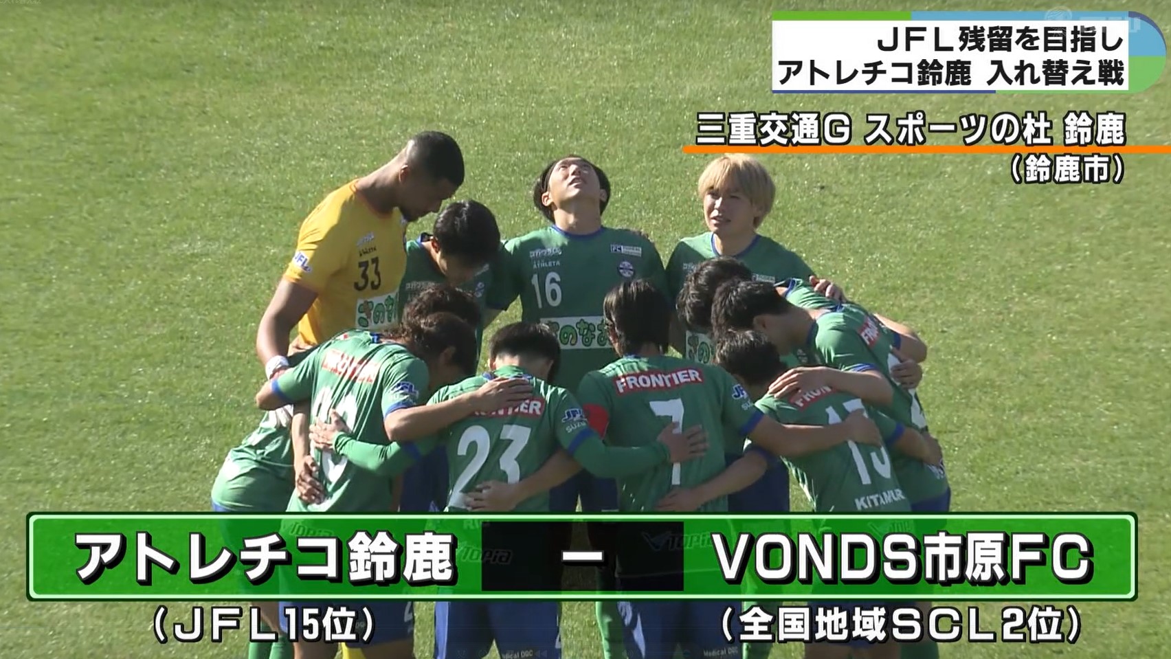 アトレチコ鈴鹿のJFL残留は叶わず、東海リーグ1部への降格が決まりました。なお、勝ったVONDS市原は3年連続の入れ替え戦で悲願のJFL昇格を決めました。
