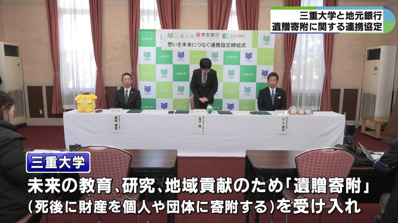 三重大学は、地元の銀行と亡くなった後に自分の財産を寄付する遺贈寄附に関する連携協定を16日に締結しました。