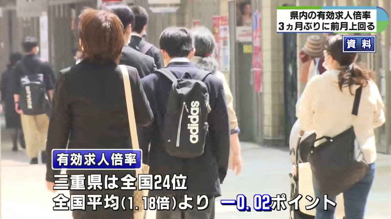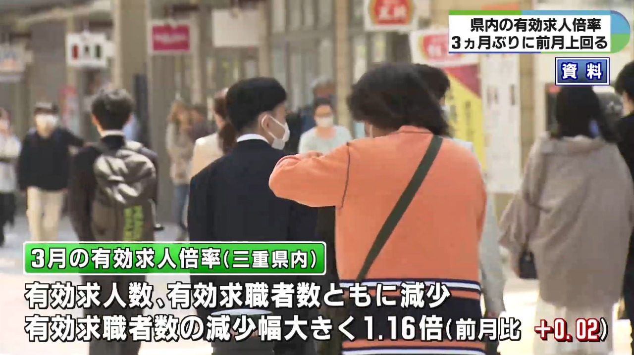 三重労働局によりますと3月は有効求人数、有効求職者数ともに減少しましたが、有効求職者数の減少幅が大きかったことから県内の有効求人倍率は前の月を0.02ポイント上回り、1.16倍となりました。